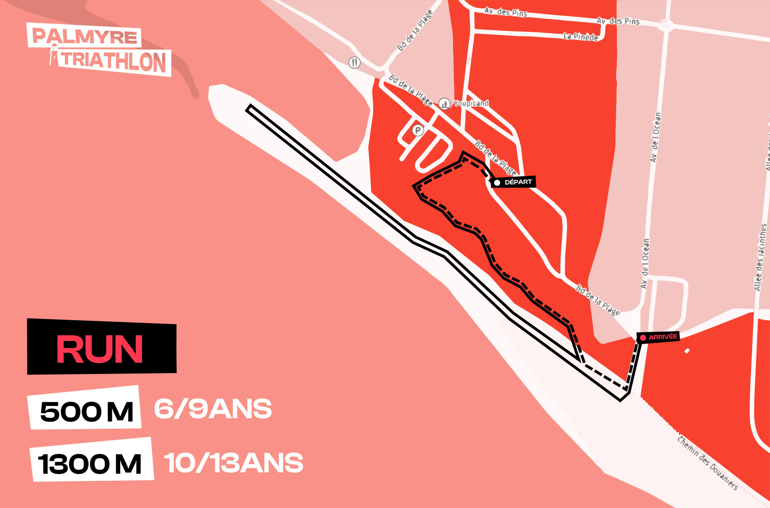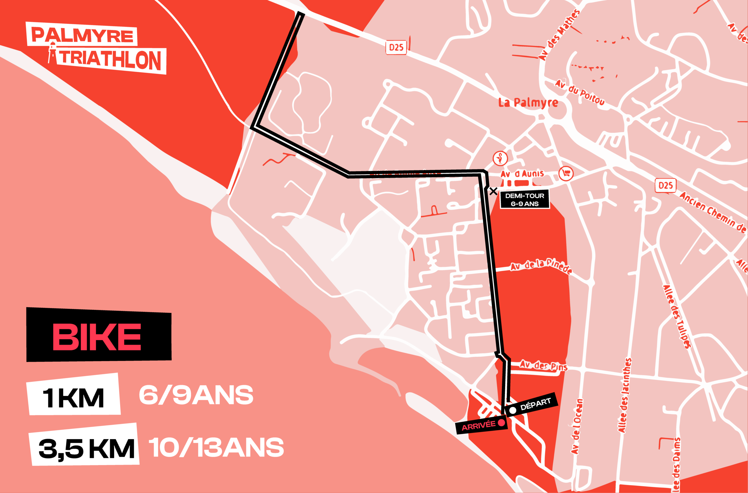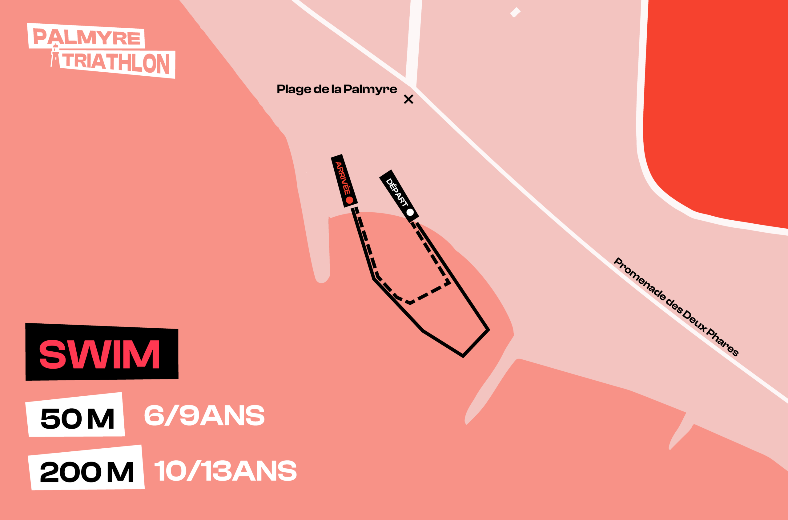 La partie Swim se déroule sur la plage de La Palmyre, dans une petite retenue d’eau naturelle accessible à marée haute, offrant des conditions idéales et une sécurité maximale pour les enfants. La transition de 250 m sera pour eux un véritable moment de gloire.